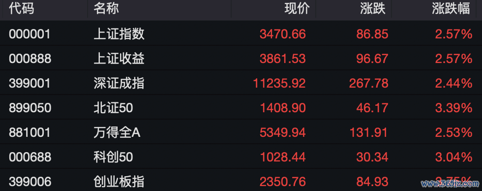 今日午后,在大金融板块爆发下,A股主要指数涨幅持续扩大,截至收盘,沪指涨2.57%,深证成指涨2.44%,创业板指涨3.75%。